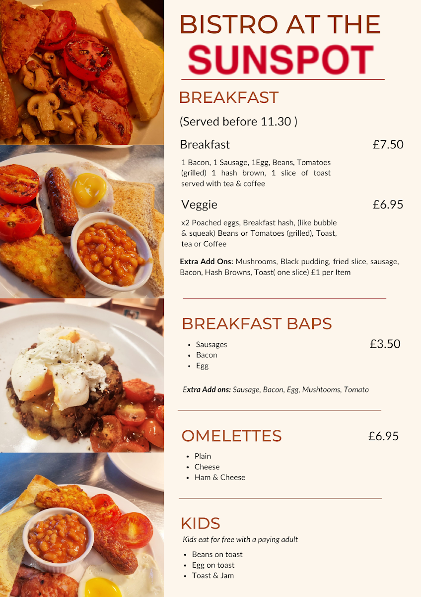 As you step inside, the aroma of freshly brewed coffee and the sound of laughter fill the air, creating an environment that feels both comfortable and lively. Whether you’re looking to fuel up for the day with a hearty breakfast or simply want to unwind with a light lunch, Bistro at the Sunspot has something for everyone. Their Main Meals menu is a testament to classic comfort food, featuring tasty options like the indulgent 1/4lb Beef Burger and the ever-popular American Chicken Patty Burger. For those in the mood for something lighter, the Scampi, Chips & Peas is a must-try, showcasing the freshness of the ingredients while packing in plenty of flavor.